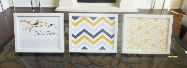![]() Birds on Branches with flowers $14.99 Two birds of a feather, starring at each other…Nursery rooms can always use some extra wall decals or framed art. This set of 3 children’s art allows you to customize the print to your child’s name, giving your baby room an added personal touch. The birds & the branches are in a charcoal colour, and the flowers are in a mango colour. The flower patterned print is in mango, and the zig zag patterned print is in mango, charcoal & silver. |