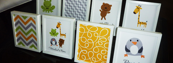![]() Frog, Giraffe, Penguin, Bear $35.99 Carry your animal themed baby room to your nursery wall art. This set of 8 children’s art features four delightful animals, a frog, penguin, giraffe, and teddy bear. Your child’s name will be custom printed below the four animals. The zig zag pattern is in lime, mango and gray. The swirl design is in mango. |