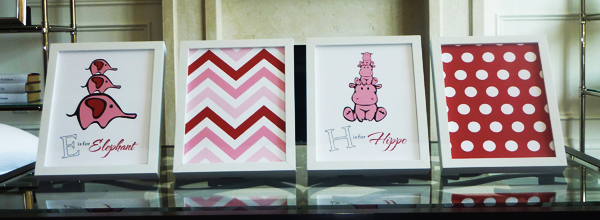 ![]() Elephants & Hippos - Pink $17.99 E is for Elephant and H is for Hippo, one, two, three in total! This pink & red themed children’s print comes in a set of 4 showing pink elephants & hippos along with white polka dots in a solid red background and light pink, dark pink, & red zig zag pattern. Add these animals to your nursery room and it will be a great start in giving your baby the first image of a family unit. |