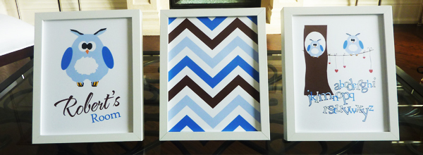 ![]() Owls in a Tree - Blue $14.99 Looking for personalized children’s art? This set of 3 blue owl children’s print is customized to have your child’s name added directly in the print. Nursery decorating ideas are not always easy to find, these adorable owls in a tree with red hearts dangling below are sure to add a smile to your child’s face. The accompanying zig zag pattern is printed in blue, light blue, and black. |
